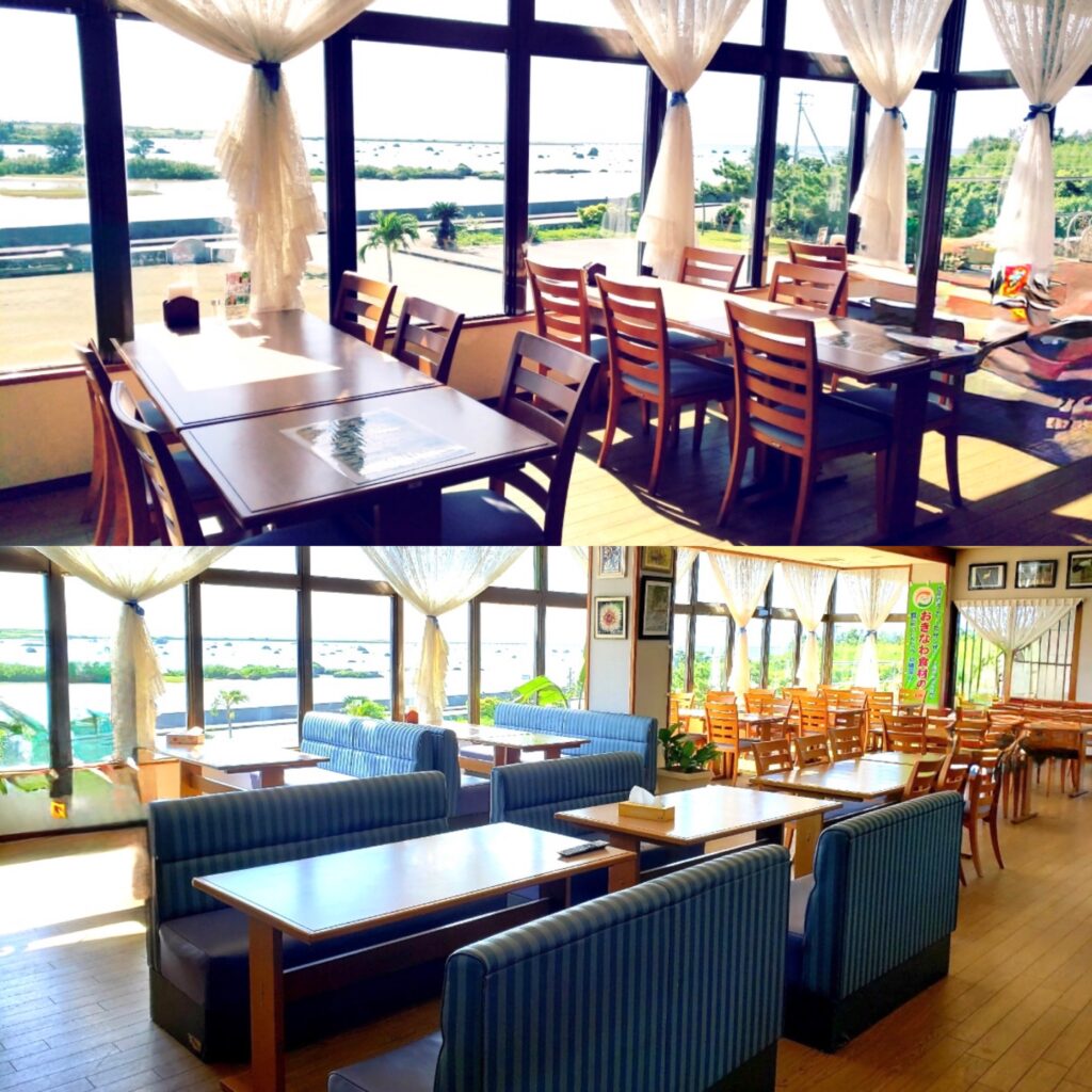 店内はナチュラルテイストで落ち着いた雰囲気。窓際の席からは、青く輝く海と白砂のコントラストが広がり、まるで絵画のような絶景が楽しめます。