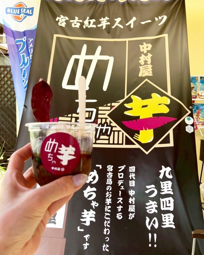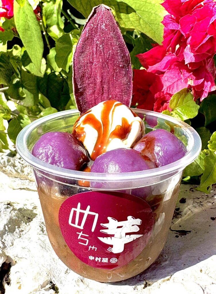 もっちり食感の紅芋団子に、宮古ぜんざいとアイスをトッピングし、濃厚な黒糖蜜をかけた贅沢な一品です。
