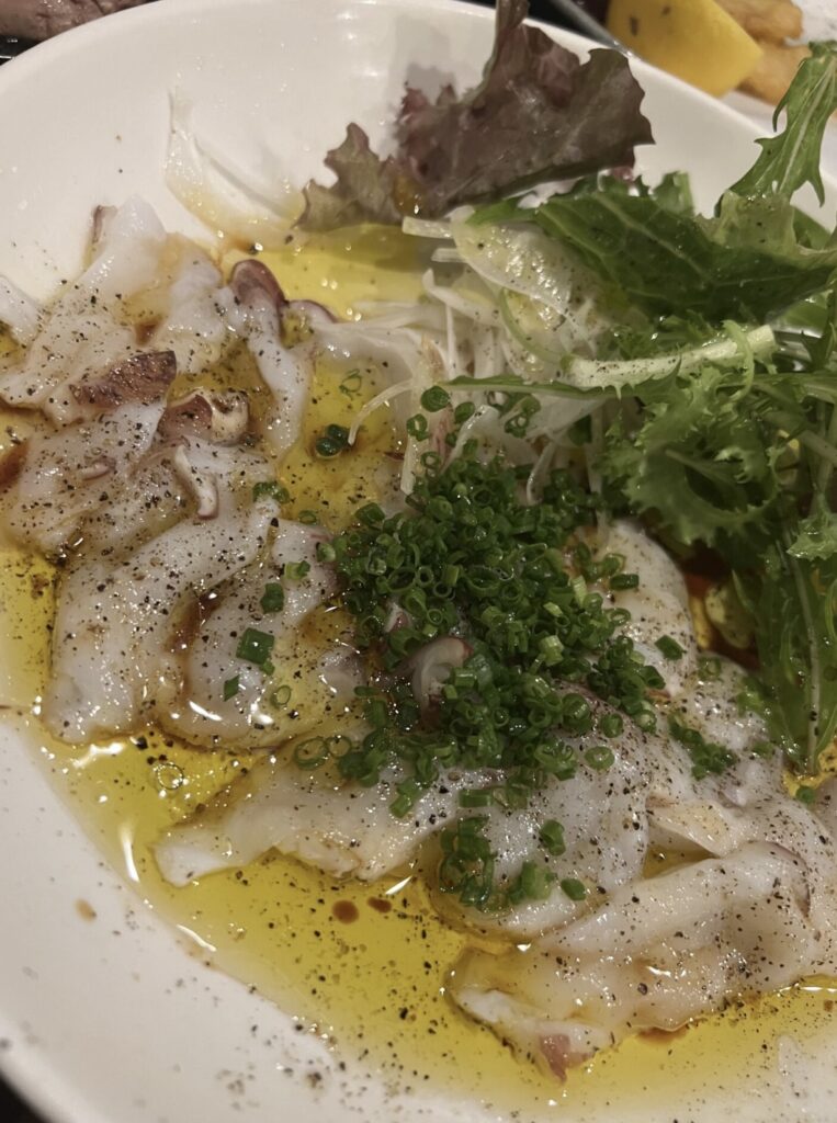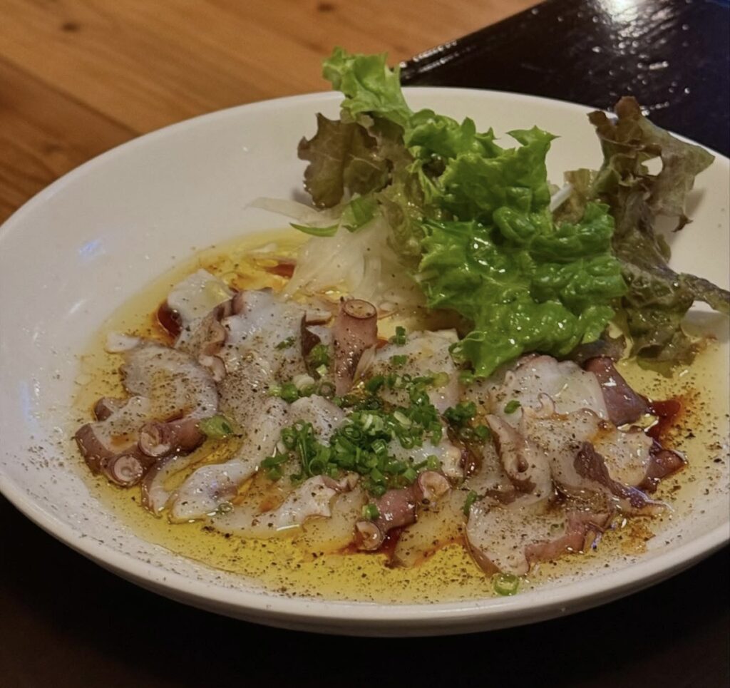 この島タコのカルパッチョは、特製の自家製ドレッシングが美味しさの鍵。オリーブオイルのまろやかさに、ほんのり柑橘の酸味を加え、島タコの旨みを引き立てる絶妙なバランスです。一口食べれば、コリッとした弾力と爽やかな酸味が口いっぱいに広がり、泡盛や白ワインとの相性も抜群。まさに“宮古の海とテーブルの共演”です。