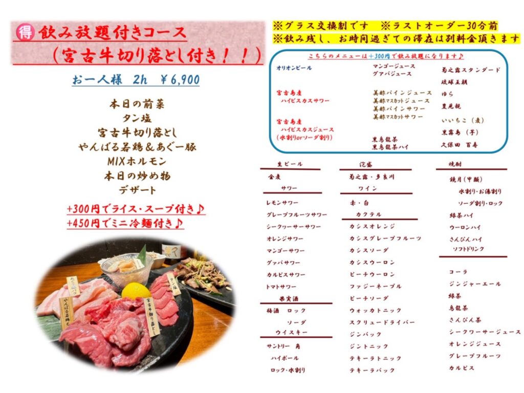 🥩 得飲み放題付きコース(宮古牛切り落とし付き)
