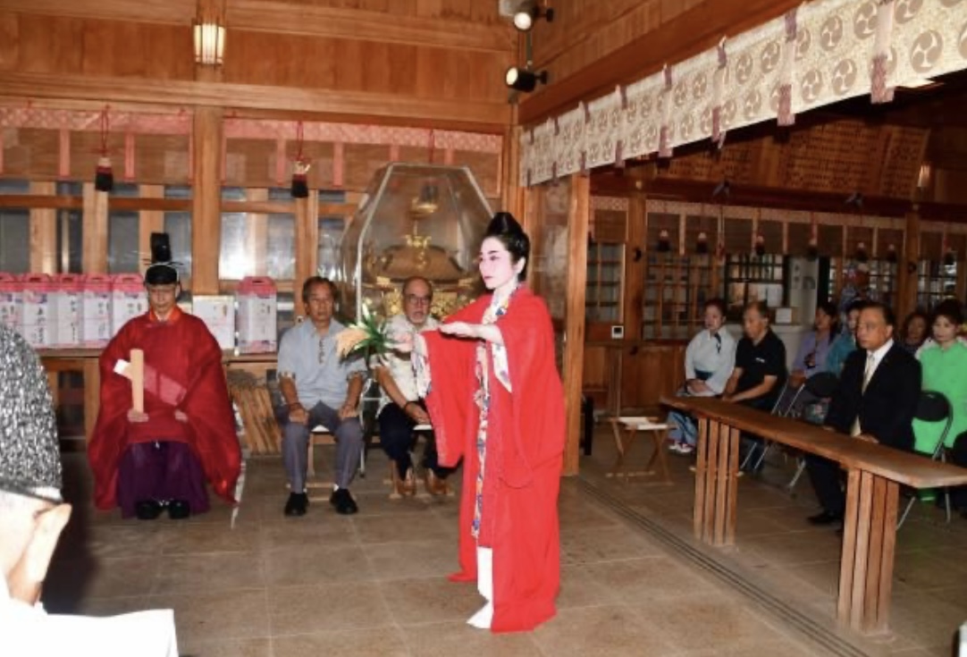 地元の舞踊家による伝統舞踊「大世栄(うふゆえい)」が奉納され、色鮮やかな衣装と優雅な舞いが神前を彩りました。静かな境内に響く太鼓の音と舞踊のリズムが、宮古島の文化の奥深さを感じさせます。