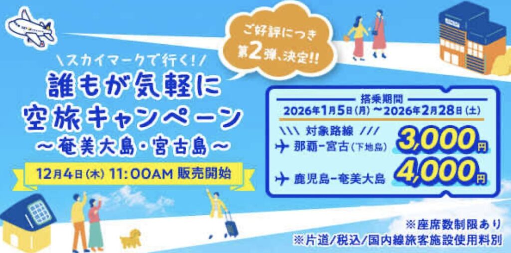 スカイマークは「誰もが気軽に空旅キャンペーン〜宮古島〜」第2弾を発表し、2025年12月4日11時より販売を開始します。対象搭乗期間は2026年1月5日〜2月28日で、片道3000円という驚きの運賃設定が注目を集めています。那覇から宮古島(下地島)への移動が一気に手軽になることで、冬の宮古ブルーを楽しむ絶好のチャンスが広がります。