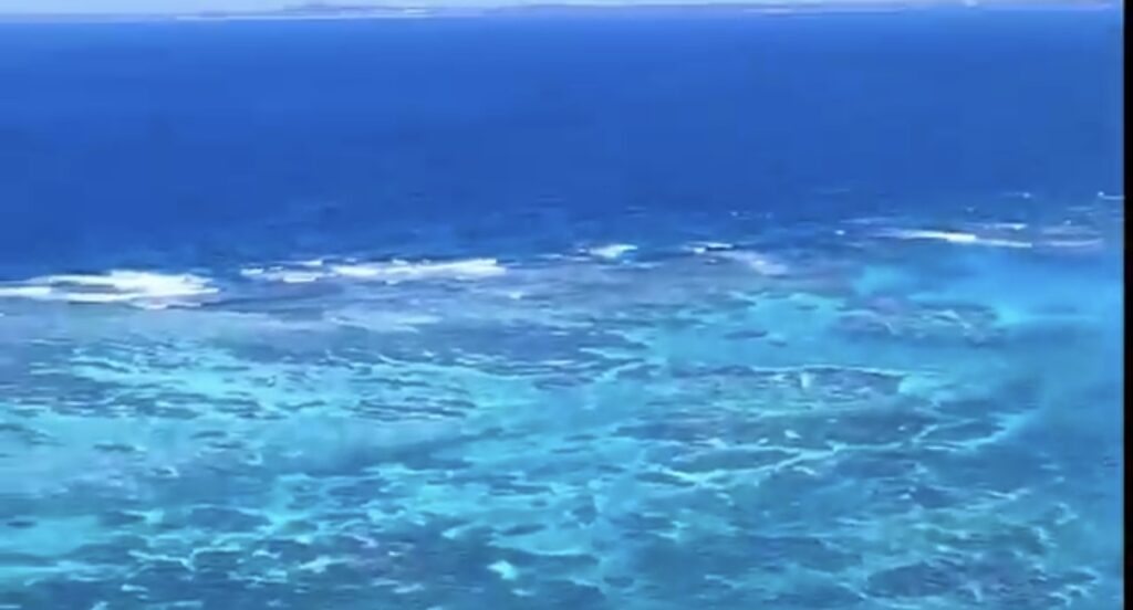 伊良部島の断崖に設置された三角点は、宮古ブルーとサンゴ礁を真下に見下ろせる圧巻の絶景スポットとして知られています。浅瀬のエメラルドグリーン、サンゴの模様、沖合の濃い青が重なり、まるで海の絵画のような景色が広がります。しかし現在は安全のため立ち入り禁止となっています。崖は柵がなく風も強いため、事故を防ぐ目的です。動画では、かつての景色を安全な場所から撮影した映像としてご紹介しています。