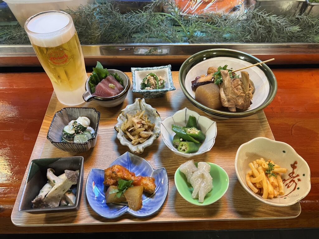 名物は大鍋でじっくり煮込まれた島おでん。宮古牛のスジ、柔らかい大根、味が染みた旬の具材がほかほかと湯気を立てます。ふわとろの出汁巻きや揚げ出し、しょうが焼きなどの定食メニューも人気。小鉢やおばんざいが並ぶ料理は、どれも家庭的で優しい味わい。深夜でもしっかり食べられるのがうれしいポイントです。