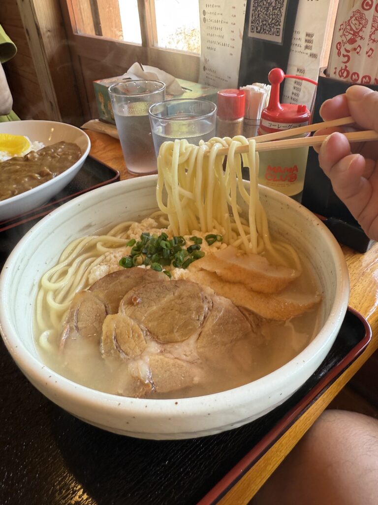 そんな島豆腐をたっぷりと味わえるのが、「ゆし豆腐そば」。かつお節と豚肉をベースにした優しい出汁に、ふわふわのゆし豆腐がたっぷりと浮かびます。風味豊かなスープは最後の一滴まで飲み干したくなる美味しさ。肉厚の三枚肉がコクと満足感を加え、全体のバランスを絶妙に仕上げています。