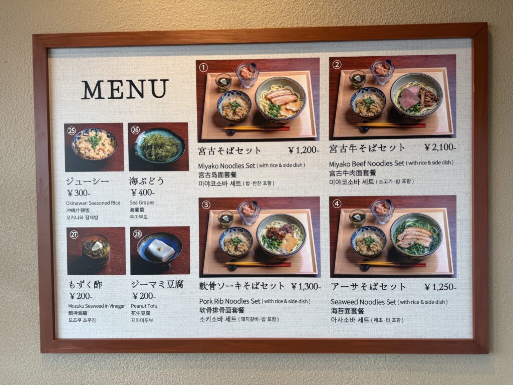 壁の解説やメニュー案内がとても丁寧なので、初めて宮古そばを食べる方にも親切なお店です。