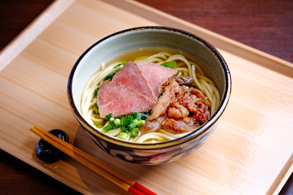 新来そばの大きな魅力は、宮古島焼肉「火神(かがみ)」が手掛ける宮古牛そばが味わえること。