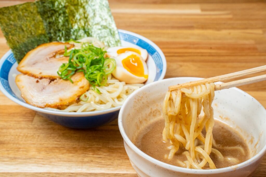 コクのある豚骨スープに魚介の旨みを重ねた濃厚つけダレが、モチモチとした自家製太麺にしっかり絡む一杯です。