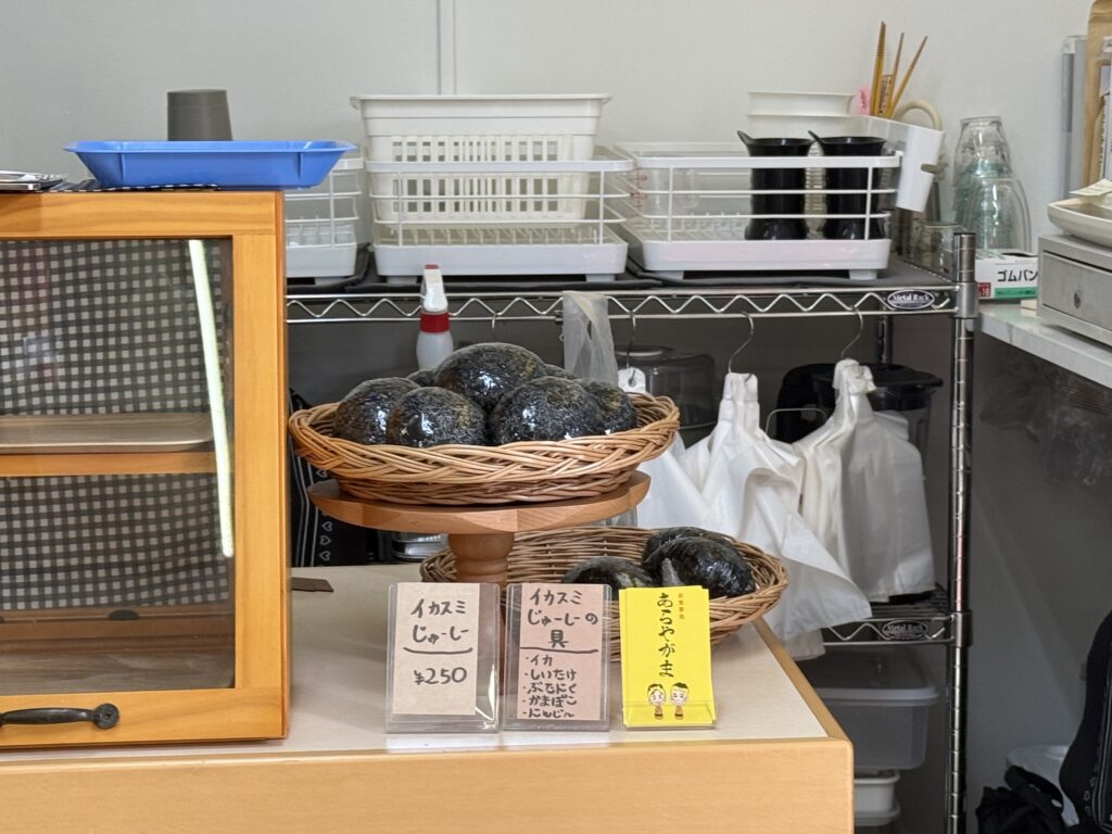 お子さま連れや年配の方でも利用しやすく、ひとりでも、家族でも入りやすいのが魅力です。入口付近には手作り感のあるおにぎりやイカスミ系メニューが並ぶこともあり、つい目を引かれます。