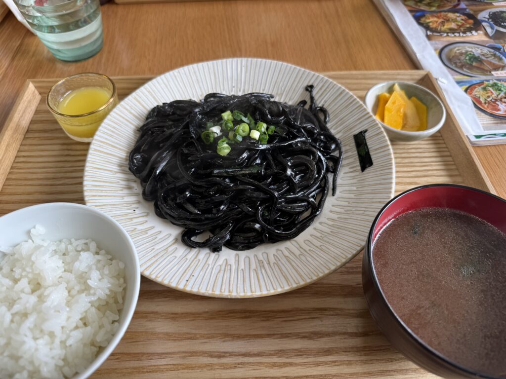 真っ黒な麺にイカスミのコクがしっかり絡み、旨み重視の味わい。ごはん・汁物・小鉢が付いた定食スタイルで、満足感も十分です。