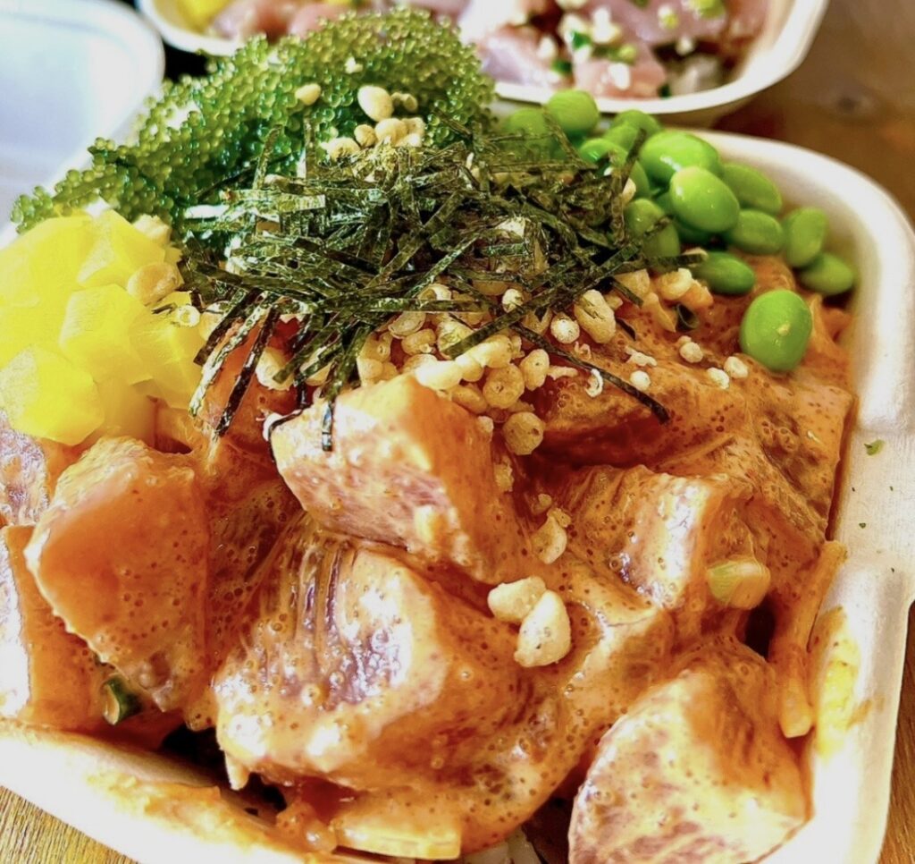 ポキ丼はハワイ生まれの海鮮丼。新鮮なマグロやサーモンなどの魚介を、醤油やごま油を使った特製ダレで味付けし、ごはんの上に彩り豊かなトッピングと一緒に盛り付けた南国グルメです。日本の海鮮丼とはひと味違う、トロピカルで爽やかな味わいが魅力。旅行中に「宮古そば以外も食べたい」「軽めにしたいけどちゃんと美味しいものがいい」という方にぴったりです。