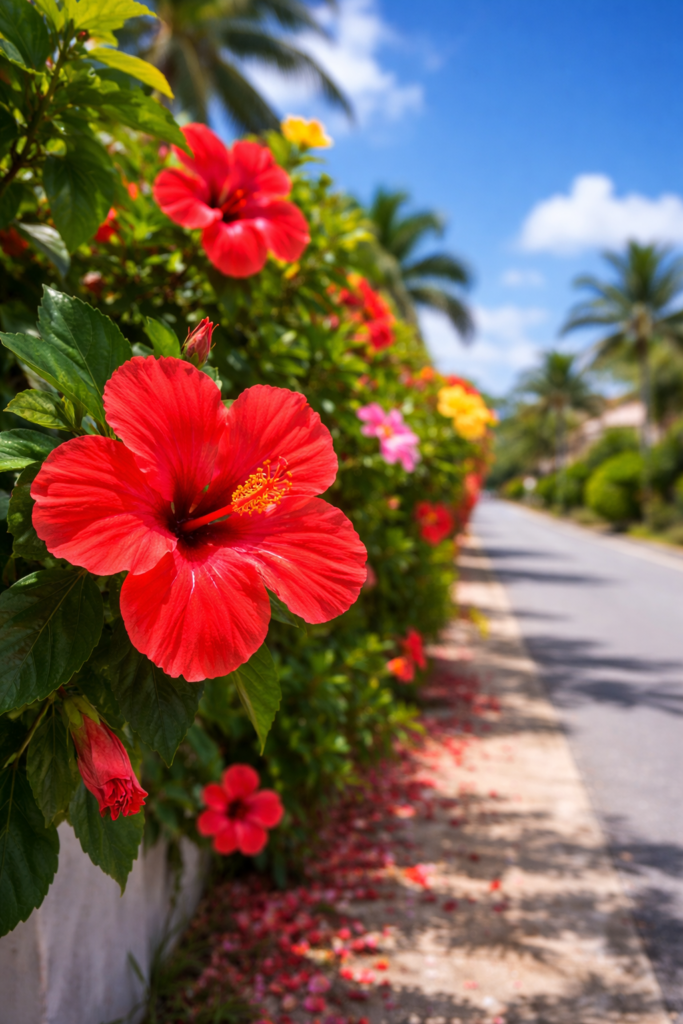大きく開く花姿は明るくエネルギッシュで、島のゆったりした空気の中に、どこか元気をくれるような魅力があります。海へ向かう途中にふと咲く一輪が、旅の景色をぐっと華やかにしてくれます。