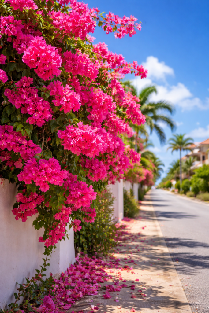 宮古島の街角でひときわ目を引くのが、鮮やかなピンクや紫、白などで咲き誇るブーゲンビリア。白い塀や南国の家並みに映え、島の景色に華やぎを添えてくれる定番の花です。
