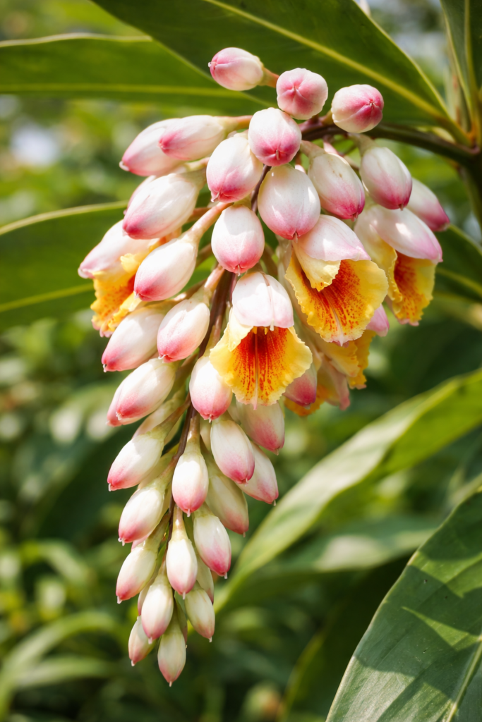 花びらのように見える部分は実は**苞(ほう)**で、中心の小さな白い部分が本当の花。派手さの中に可憐さがあり、南国らしい美しさを感じさせます。