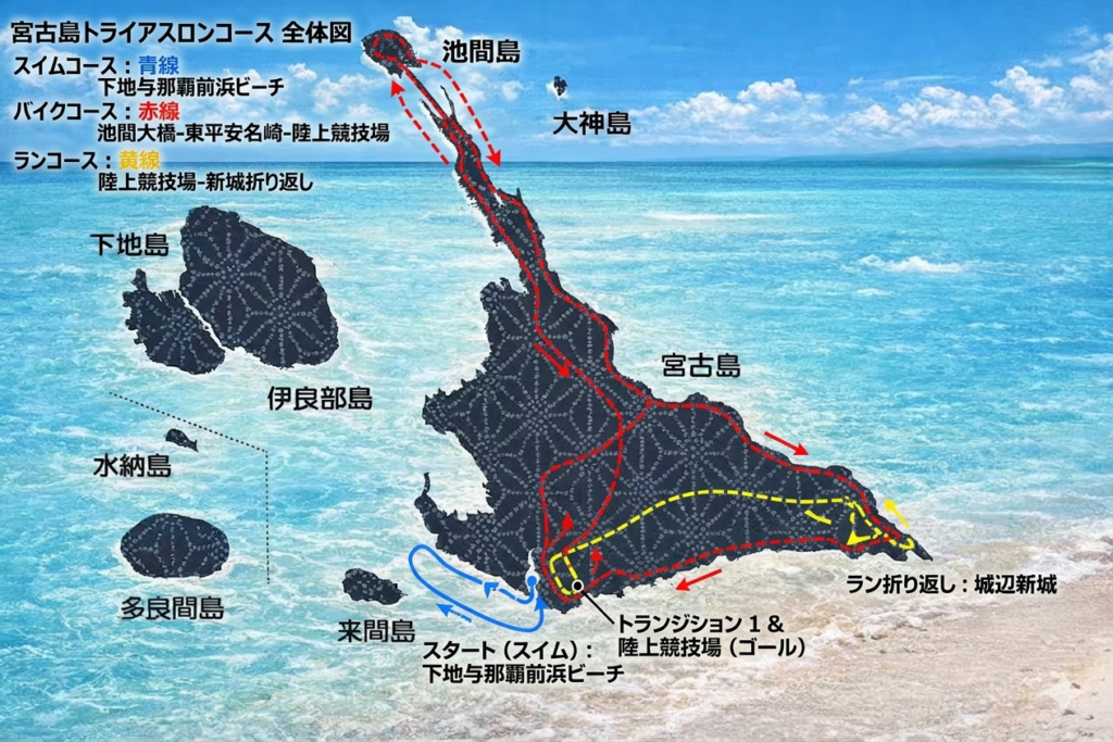 公式大会情報では、スイムは与那覇前浜、その後に宮古島全域を使ったバイクとランが続きます。