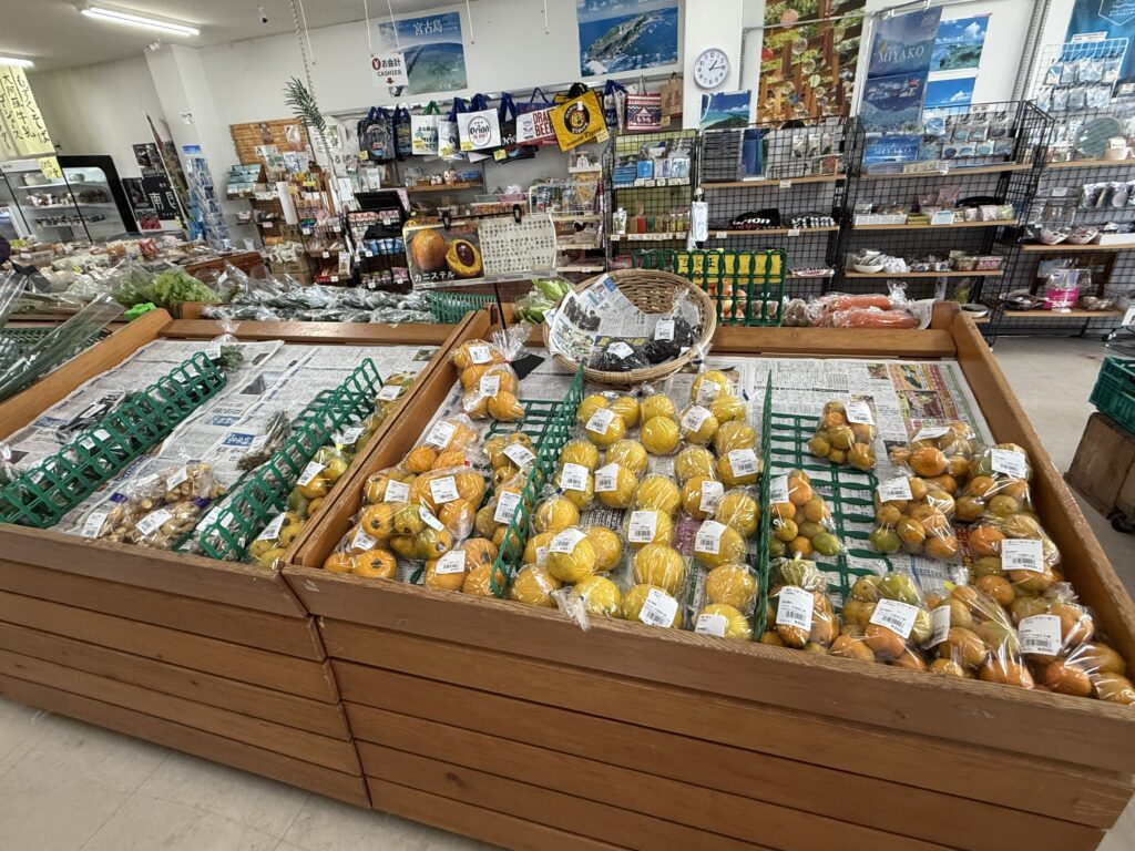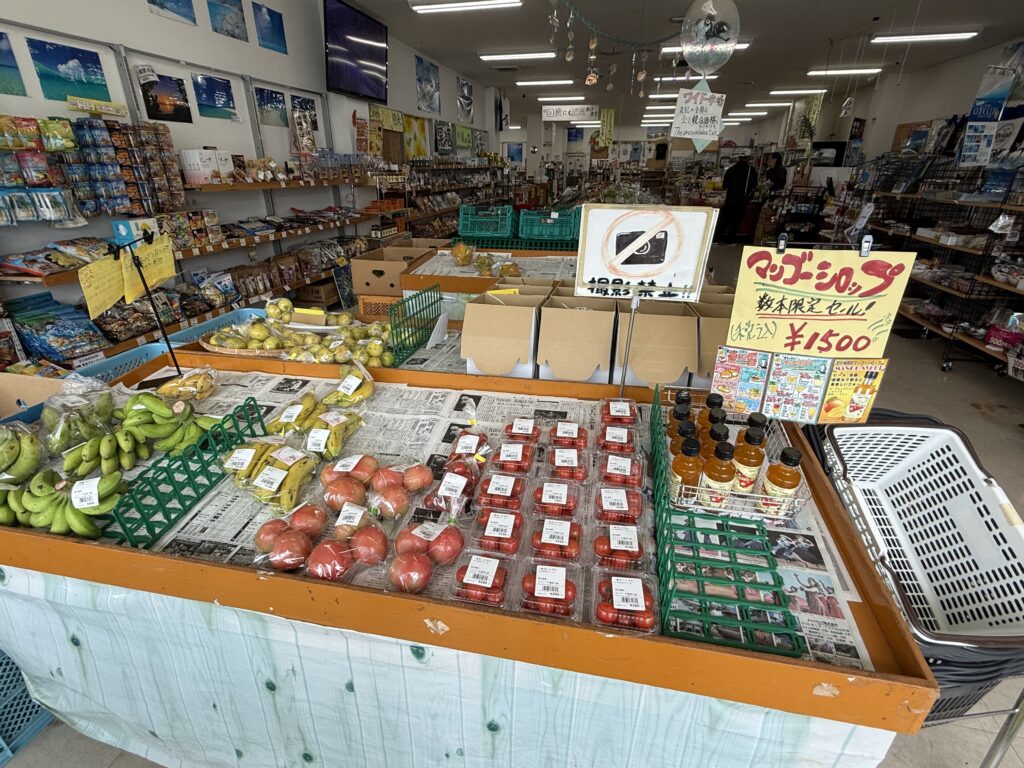 店内には、宮古島の生産者が季節ごとに直接持ち込む新鮮な野菜や果物がずらり。トウガン、ナンコウ、ナーベラ、エンサイ、ニガナ、モーウィ、ヨモギなど、スーパーではあまり見かけない島野菜も豊富に並び、訪れるたびに季節の移ろいを感じられます。シーズン中には、宮古島産マンゴーや赤肉メロンなどのフルーツも充実し、観光客からも高い人気を集めています。