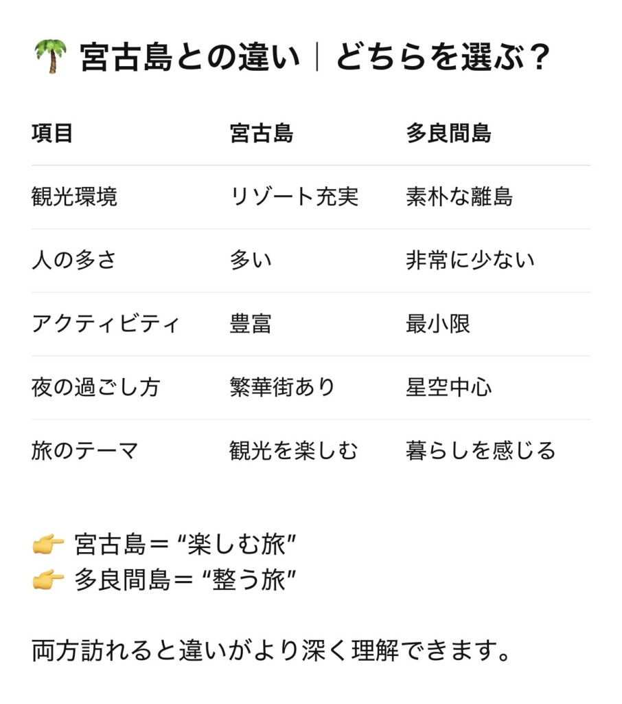A. 観光中心なら宮古島、静かな離島体験なら多良間島がおすすめです。