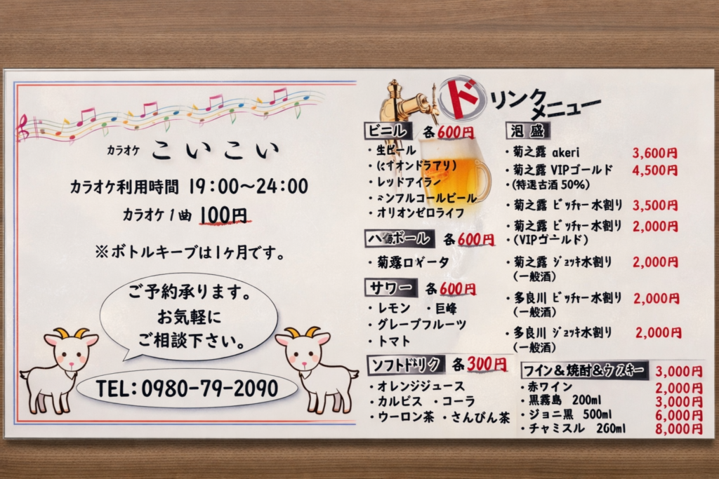 **「カラオケこいこい」**は、そんな多良間島の夜を象徴するローカルカラオケ。赤い看板の灯りがともる頃、島の一日はもう一度ゆっくり動き出します。観光客も島民も分け隔てなく迎えてくれる、島のリアルな社交場です。