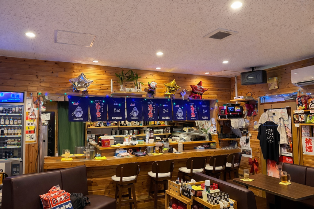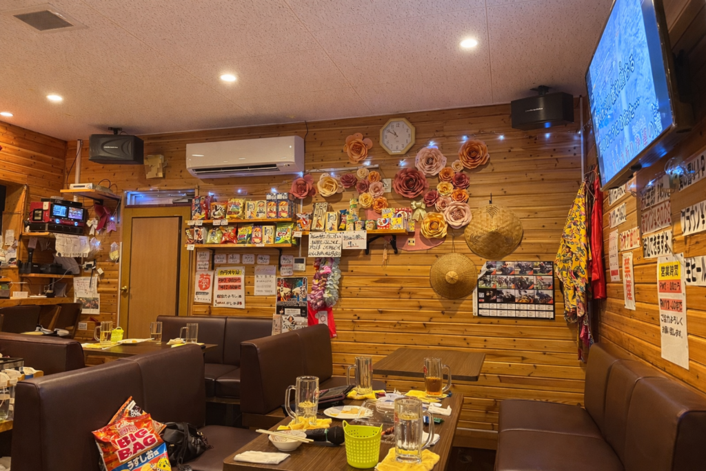 店内は木目調の温かな空間。壁には写真や飾りが並び、どこか実家のような安心感があります。マイクを握れば知らない人同士でも自然に拍手が起こり、気づけば同じテーブルで乾杯している——そんな距離感がこの店の日常です。観光客と地元の人という境界はなく、歌をきっかけに会話が生まれ、島の夜に溶け込んでいきます。昭和歌謡から最新曲まで、泡盛片手の大合唱が始まれば、多良間島らしい温かな時間が流れます。