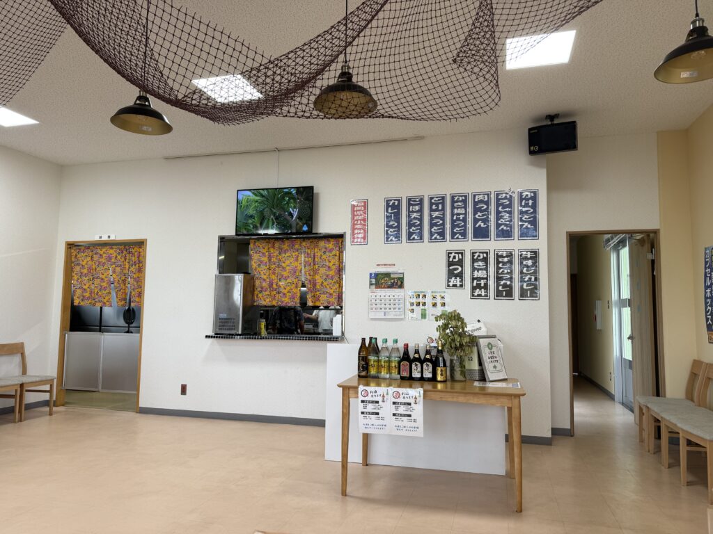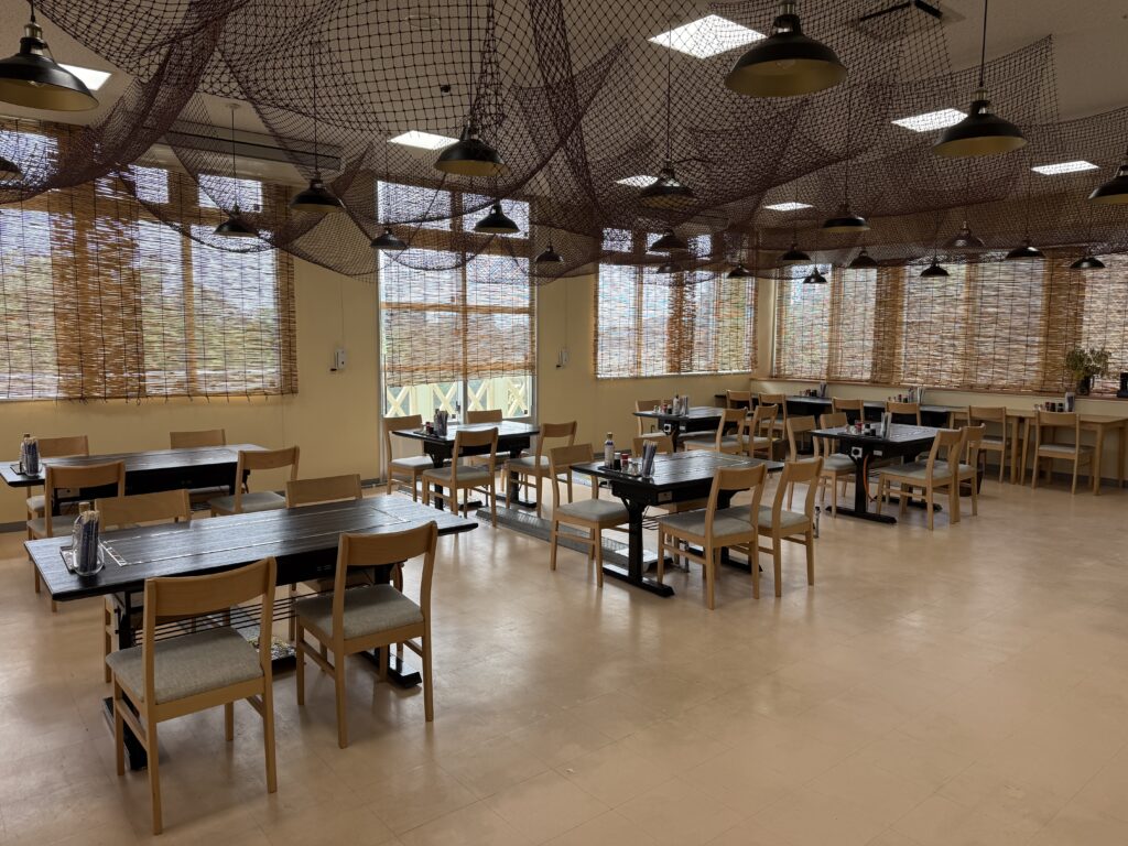 建物に入ると、広々とした開放的な食堂空間が広がり、天井には漁網をイメージした装飾。どこか懐かしく、島の暮らしを感じられる温かな雰囲気が特徴です。大きな窓から光が差し込み、ゆったりとした時間が流れています。