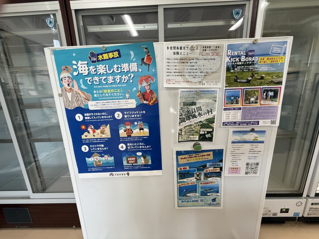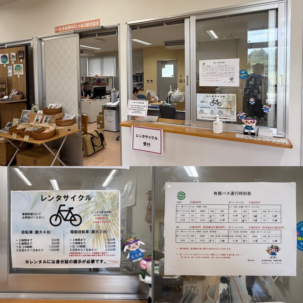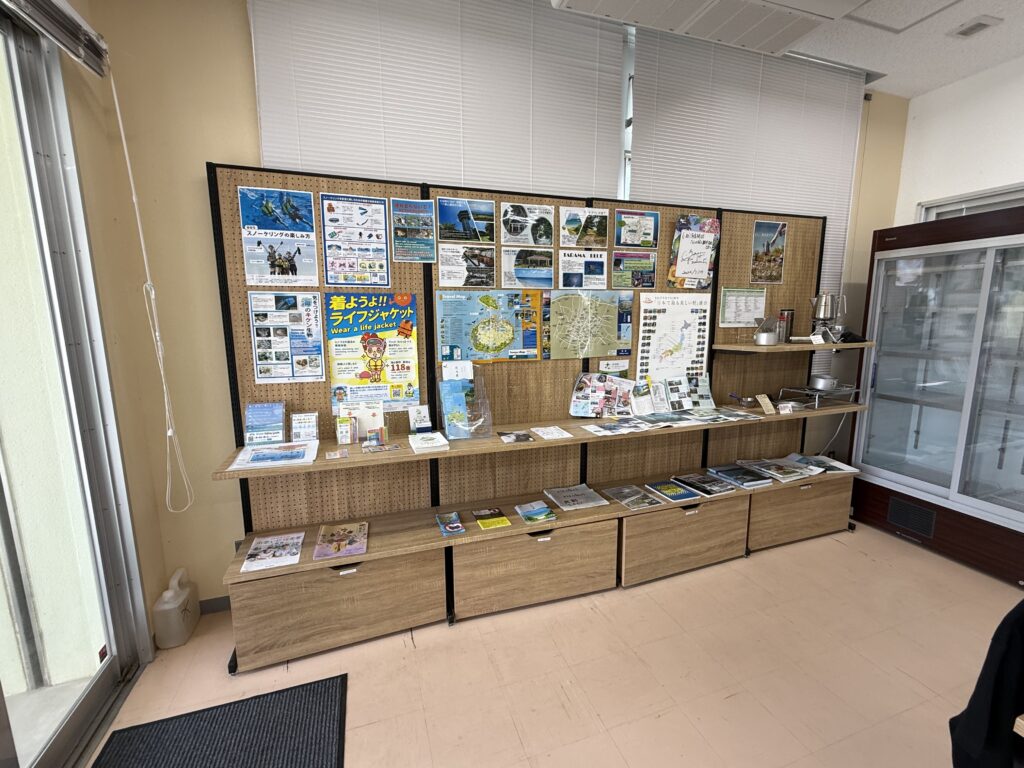 館内には観光パンフレットや島内マップ、体験情報が充実。シュノーケリング・レンタサイクル・島内散策など、最新情報をここでチェックできます。