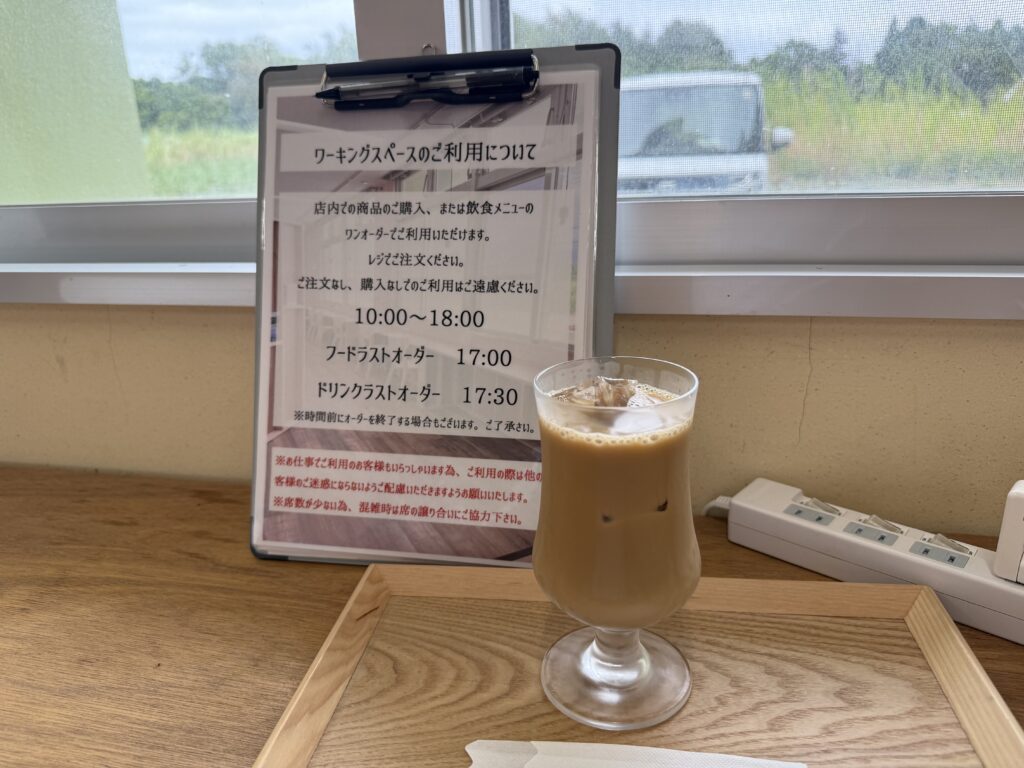 ワーキングスペースはワンオーダーで利用可能。窓辺の席では島の風景を眺めながらゆったり過ごすことができ、フェリー待ちや飛行機までの時間調整にも最適な休憩スポットです。