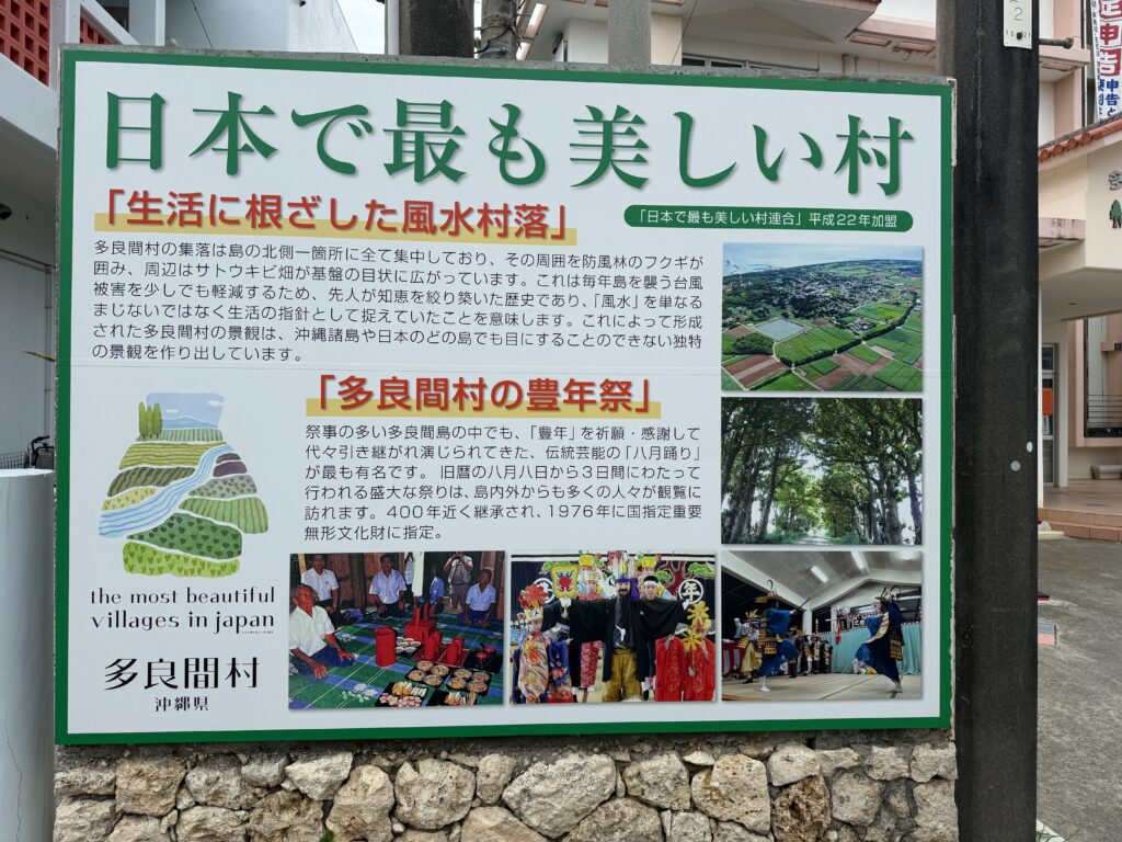 - 「日本で最も美しい村」案内板:多良間村がこの連合に加盟していることを示す、島の誇りの掲示