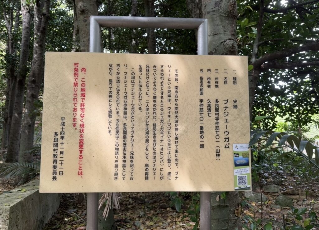 ブナジェーウガムは、多良間島に伝わる 「ブナジェー兄妹」 を祀る拝所です。伝承によると、昔この地域を巨大な津波が襲った際、ブナジェー兄妹だけが高台へ逃れ生き延びたと語られています。そして兄妹は荒廃した島を再び立て直し、人々の暮らしを再生させた存在として伝えられました。