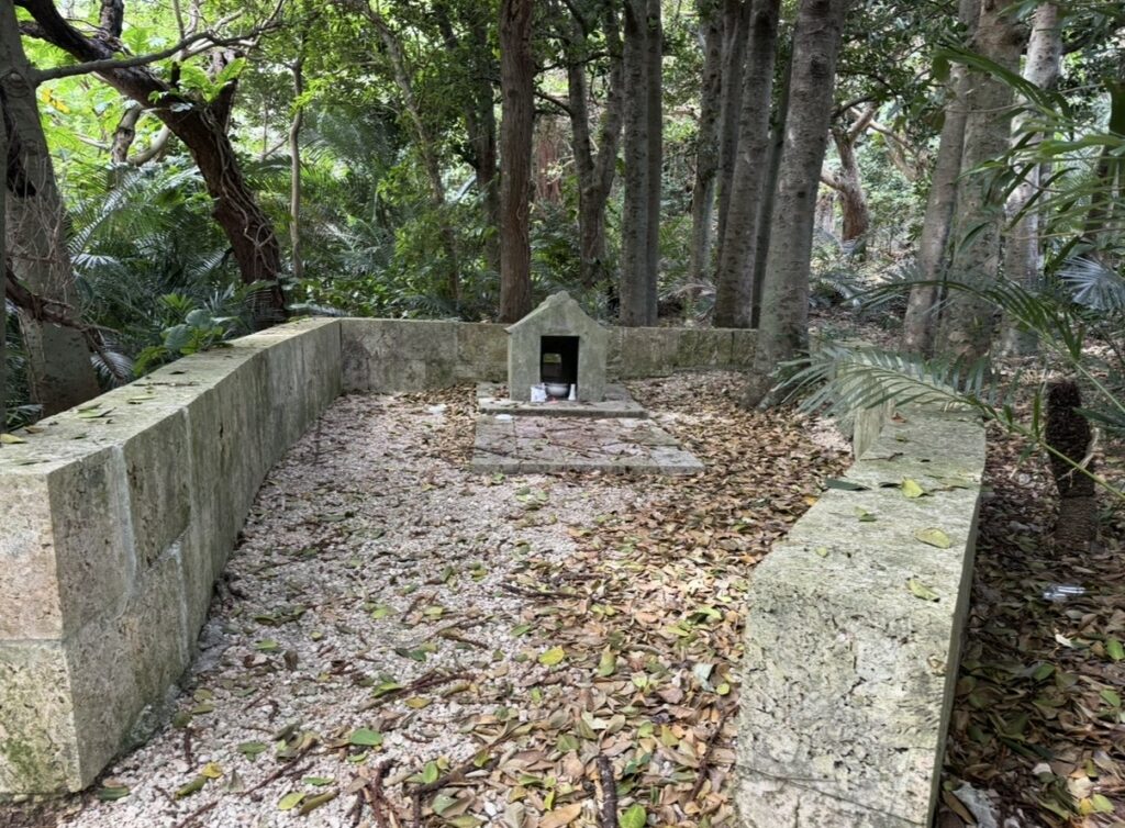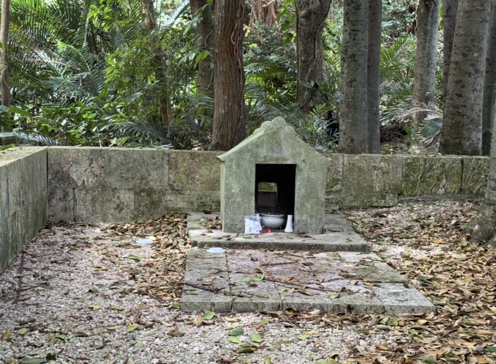 現地は写真の通り、フクギや亜熱帯樹林に囲まれた静かな森の中にあります。石囲いの参道の先には小さな祠が置かれ、今も供え物が見られることから、地域の信仰が現在も続いていることが分かります。