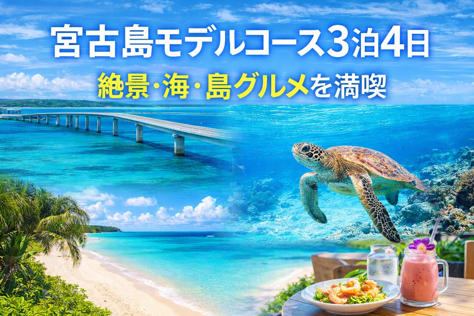 宮古島旅行をゆったり楽しむなら3泊4日がおすすめ。橋でつながる伊良部島・来間島・池間島を巡る絶景ドライブ、ウミガメシュノーケリング、南国カフェ巡りなど、宮古島ならではの魅力を無理なく満喫できます。