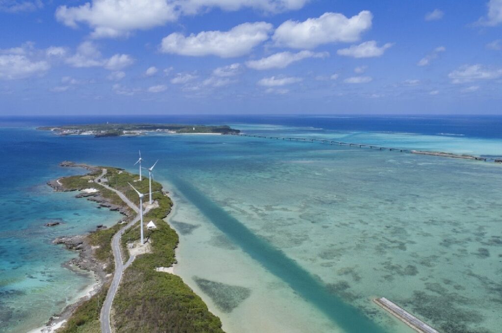 伊良部大橋は全長3540m、日本最長級の無料橋。橋の上から見える宮古ブルーの海は、宮古島旅行のスタートを飾る絶景として人気です。