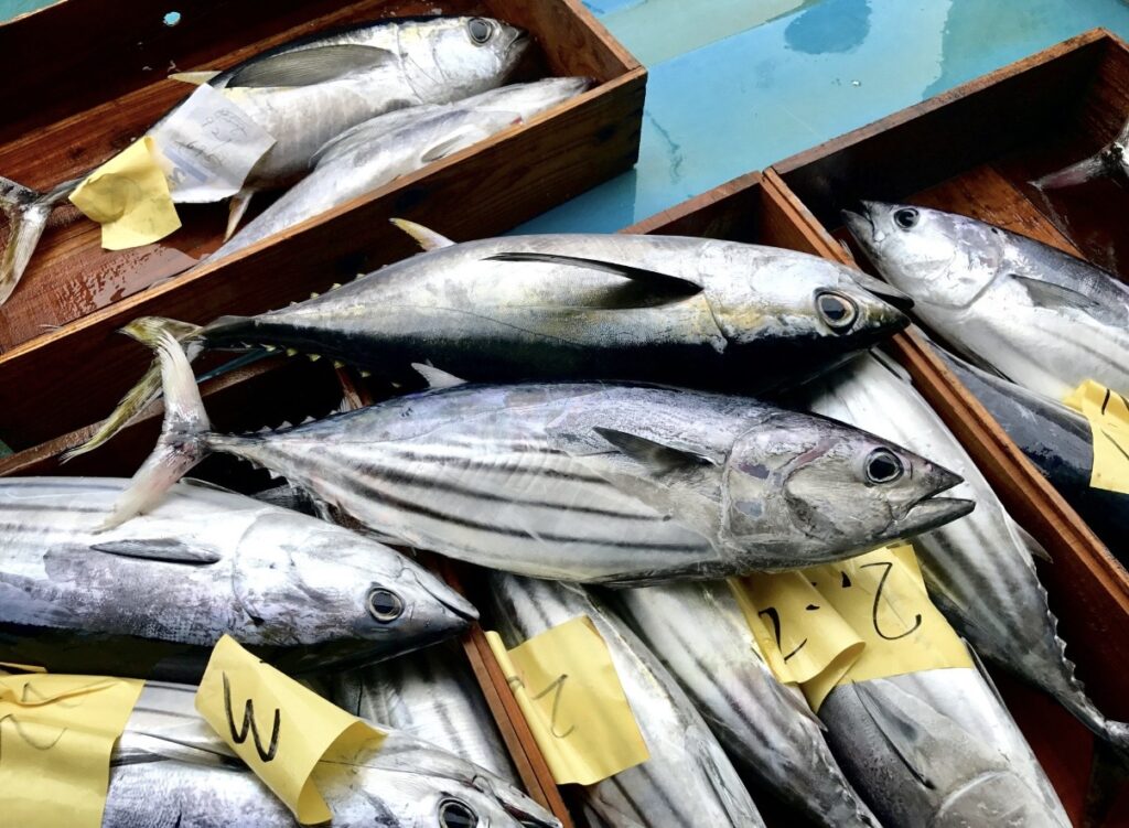 宮古島近海は黒潮の影響を受ける豊かな海域で、多くの回遊魚が集まる漁場として知られています。この海ではキハダマグロ、カツオ、シビ(若いマグロ)、グルクン、イカなどさまざまな魚が水揚げされます。特に近年は**「みやこ島まぐろ」**としてブランド化されたマグロが注目されており、宮古島の代表的な海の幸のひとつとなっています。
