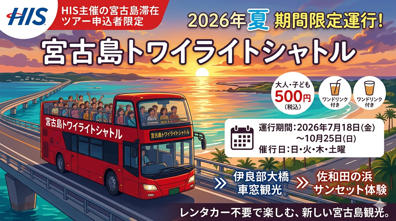 HISが2026年夏、宮古島で2階建てオープントップバス「宮古島トワイライトシャトル」を期間限定で運行します。HIS主催の宮古島滞在ツアー申込者限定で500円(大人子ども同額・ワンドリンク付き)運行期間は2026年7月18日〜10月25日、催行日は日・火・木・土曜。ルートは宮古島内のホテル発着で、伊良部大橋の車窓観光と佐和田の浜でのサンセット体験が柱。レンタカー前提と思われがちな宮古島観光に新しい選択肢が加わろうとしています。