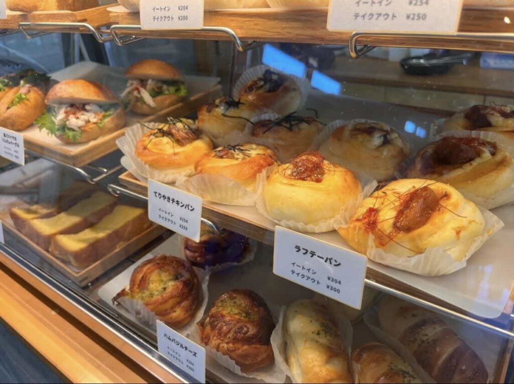 ショーケースにはサンドイッチや惣菜パンが並び、朝食や軽食にぴったり。BLTやバジルチキンなど、食べ応えのあるメニューも充実しています。