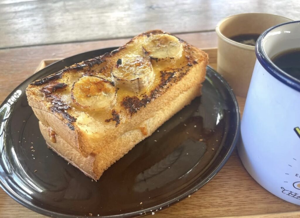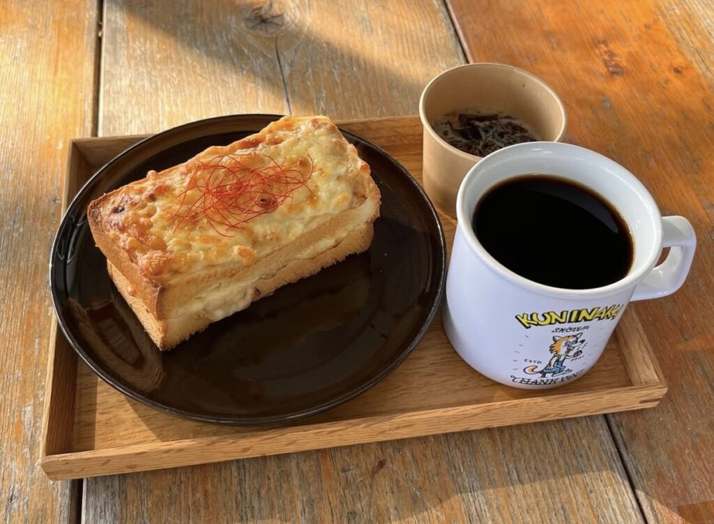 朝8:00からスタートするモーニングは、國仲商店の魅力のひとつ。コーヒーとパンを組み合わせたシンプルな朝食は、旅のはじまりにぴったりの時間です。