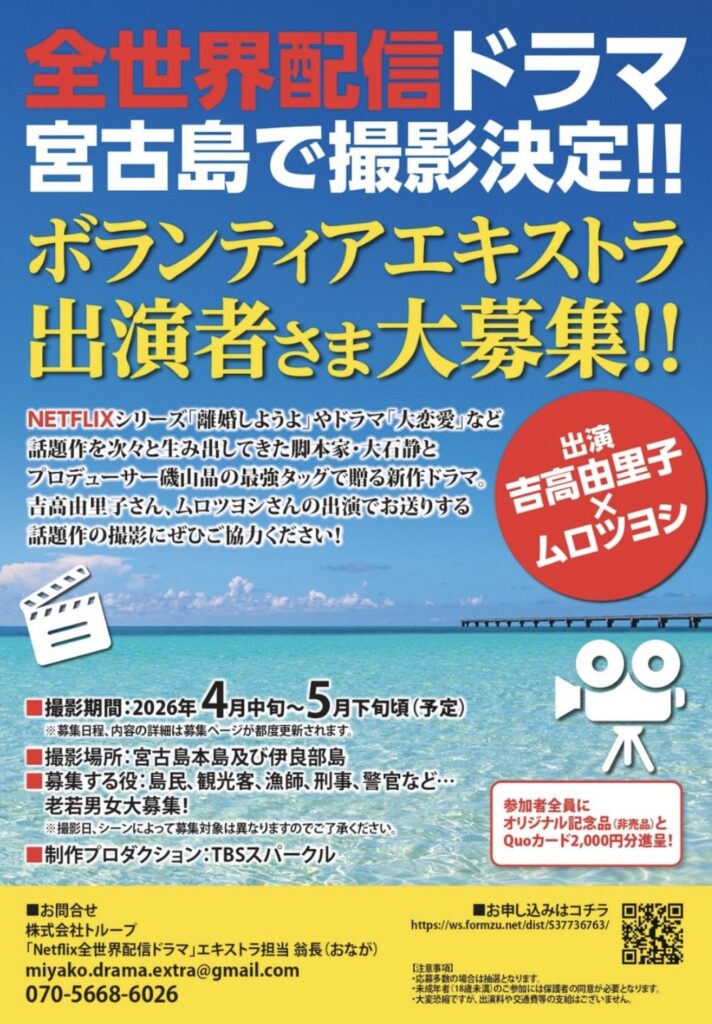 宮古島で“世界配信ドラマの撮影が決定。2026年4月中旬〜5月下旬にかけて撮影が行われ、現在ボランティアエキストラを募集中。誰でも応募可能で、参加者には記念品とQUOカード2,000円分が進呈されます。