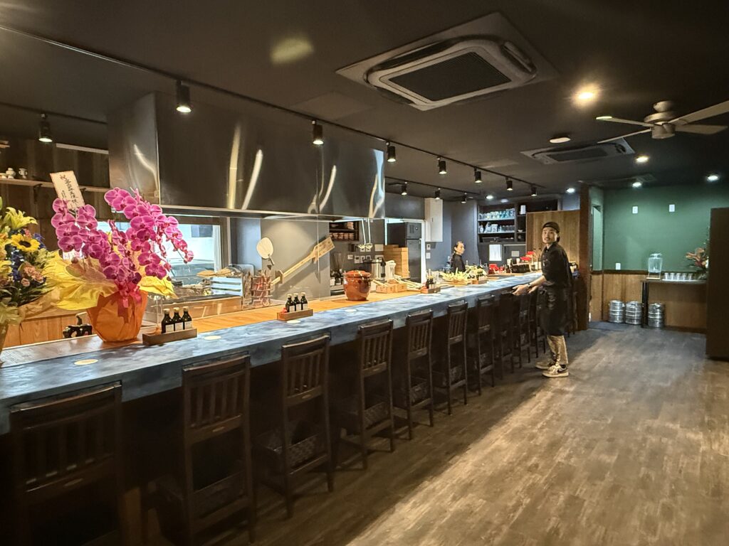 暖簾をくぐった瞬間、まず目に入るのが印象的な青を基調にしたロングカウンター。まるで宮古ブルーを店内に映したようなカウンターと、木の温もりを感じる空間がとても心地よく、写真映えも抜群です。