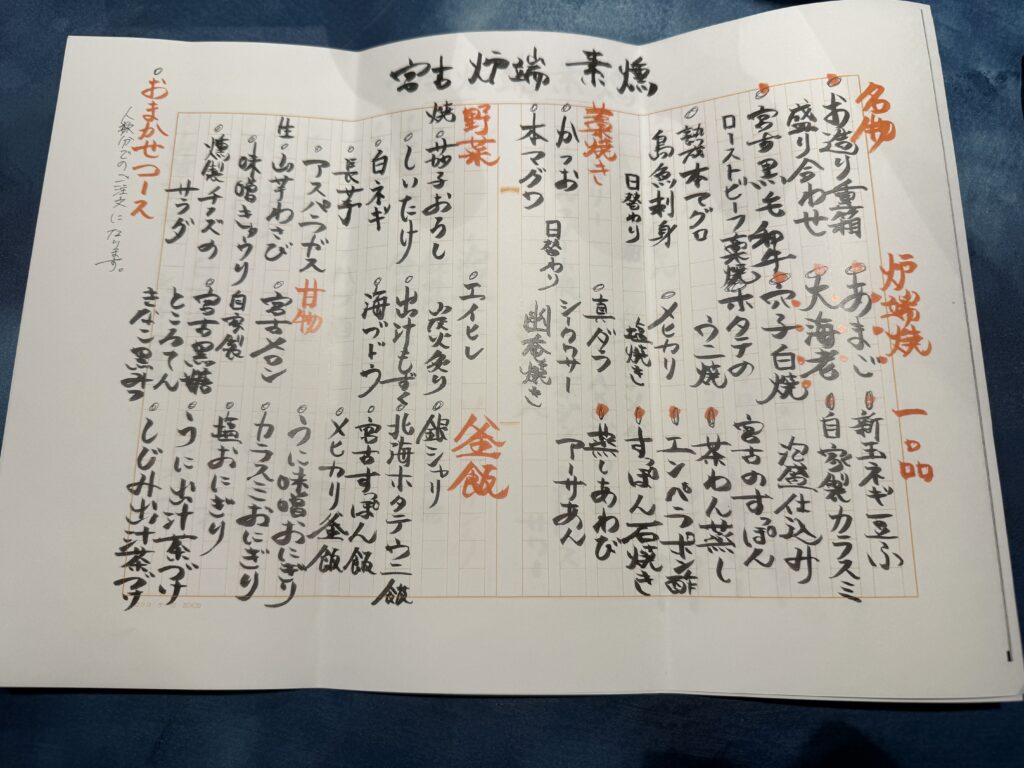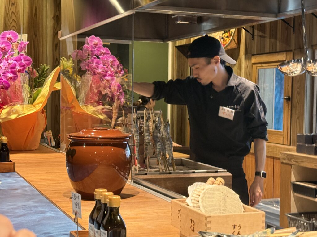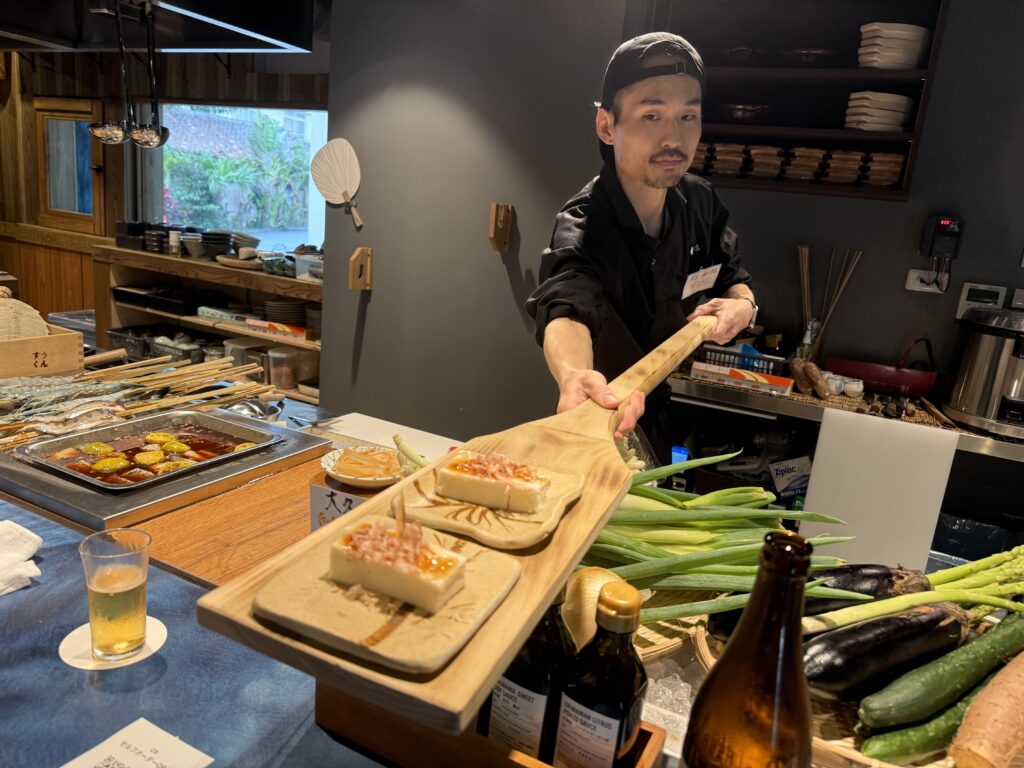 写真のように、島豆腐の炙り、車海老の塩焼き、炉端で焼く旬魚、宮古牛の藁焼き、旬野菜の炭火焼きが次々に提供され、料理そのものがエンターテインメント。ただ食べるだけではなく、旅の夜の思い出として残る一軒です。