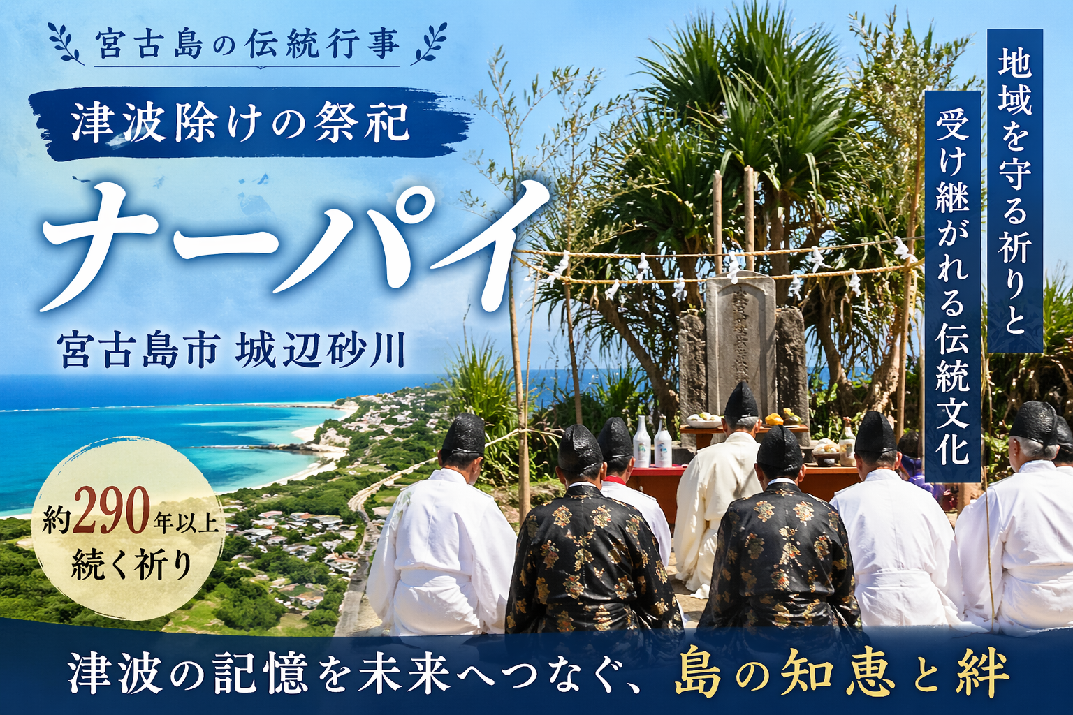 宮古島市城辺砂川で、津波災害から地域を守る願いを込めた伝統祭祀「ナーパイ」が行われました。約290年以上続くとされる歴史ある行事で、災害への備えと祖先への感謝、地域の結束を今に伝える宮古島ならではの文化です。島の暮らし