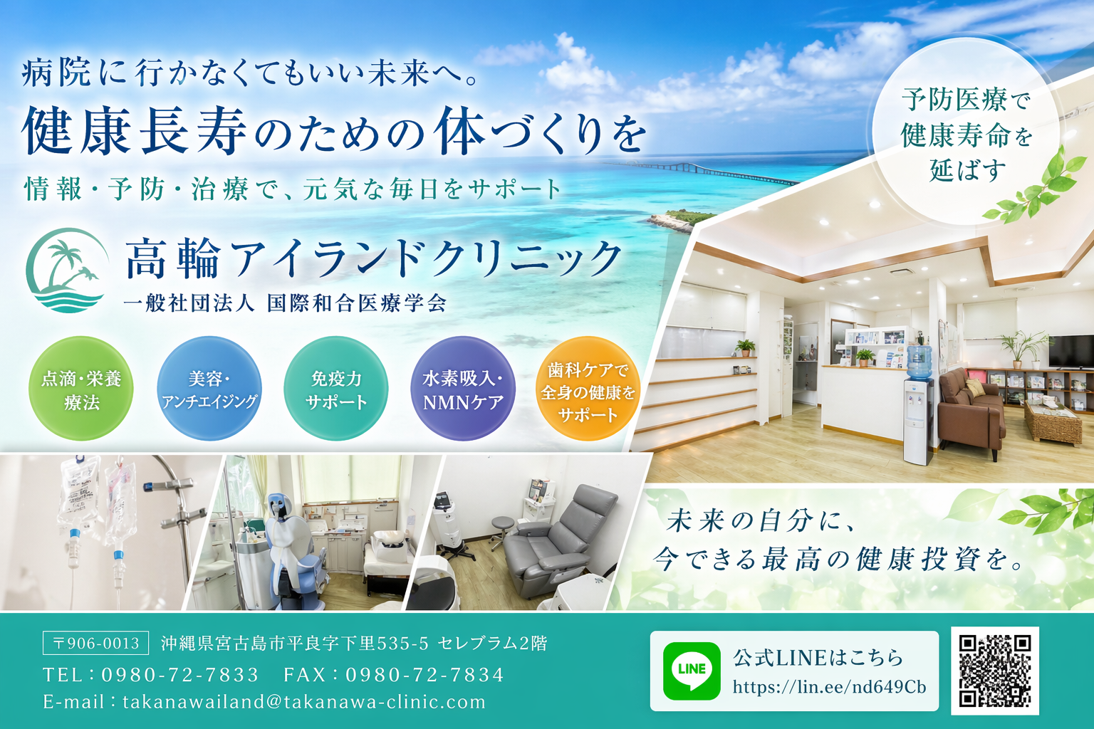 宮古島にある高輪アイランドクリニックは、健康長寿を目指すための情報提供・予防ケア・治療を行う、新しい時代のクリニックです。