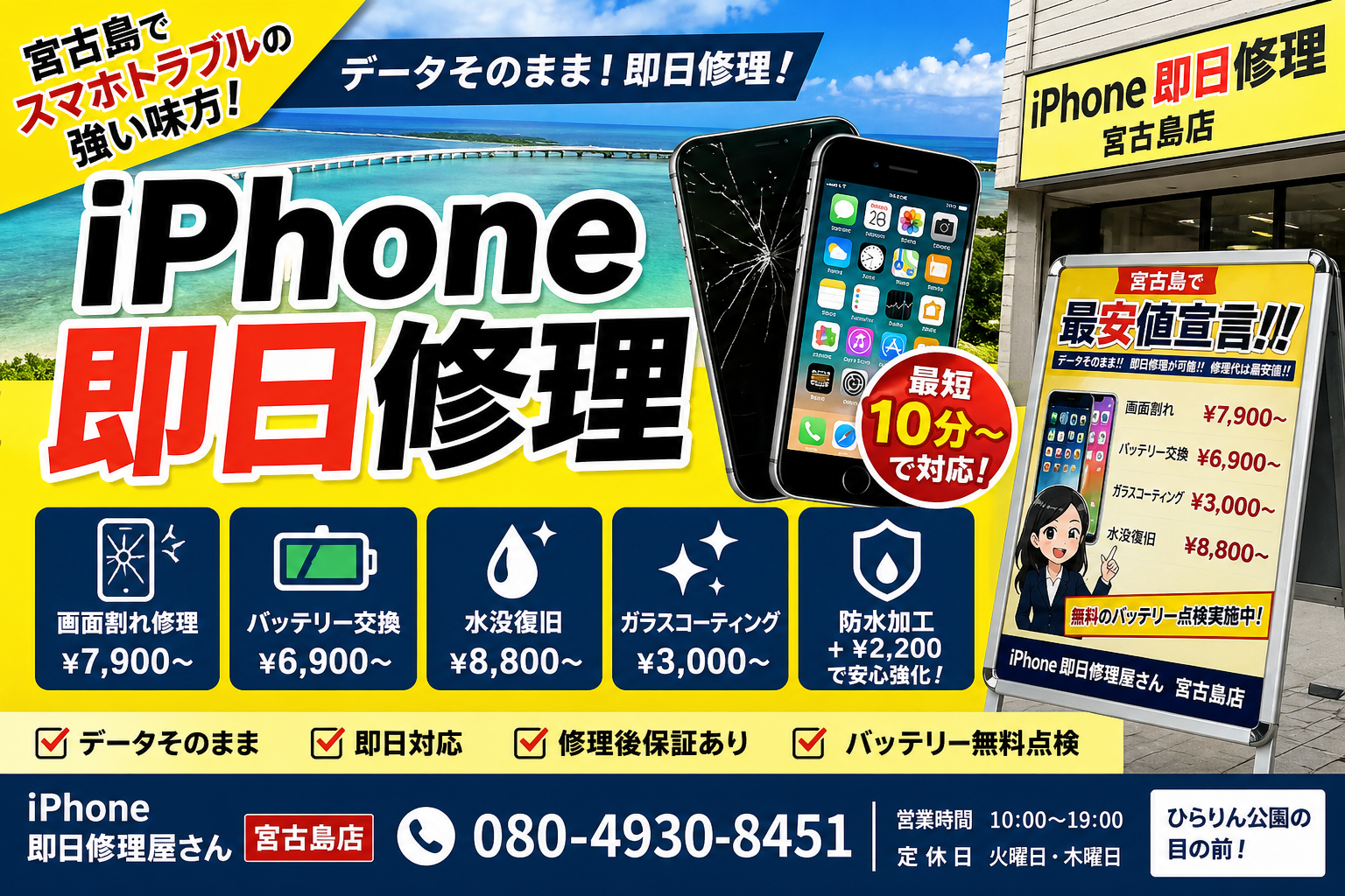 宮古島で突然のスマホトラブル。「画面が割れた」「電池の減りが早い」「水没してしまった」そんな時に頼れるのが即日対応のiPhone修理サービスです。最短10分〜のスピード対応とデータそのまま修理が特徴で、観光客・島民どちらにも支持される“島のスマホ駆け込み寺”的存在です。