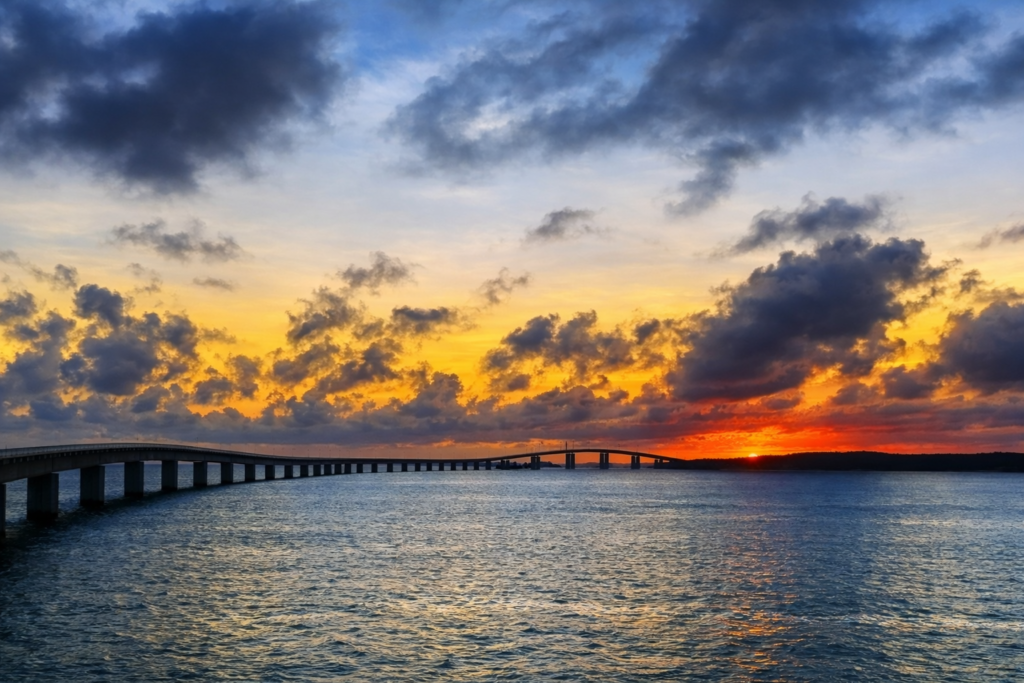 帰路は、夕暮れの【伊良部大橋】を渡って宮古島本島へ。橋の上から眺める夕日は圧巻で、まるで黄金色の道を走るような体験ができます。