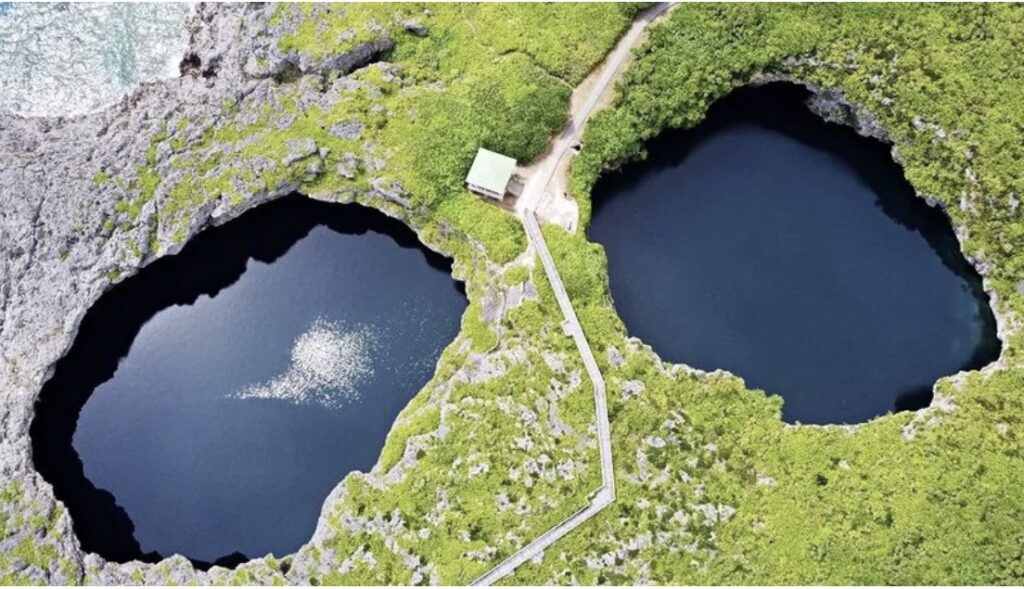 伊良部島の代表的な景勝地「通り池」。2つの池が地下でつながり、さらに海とも通じる神秘的な地形が特徴です。国の名勝・天然記念物にも指定されており、ダイビングスポットとして世界的にも知られる観光名所です。📍 Googleマップで場所を確認する