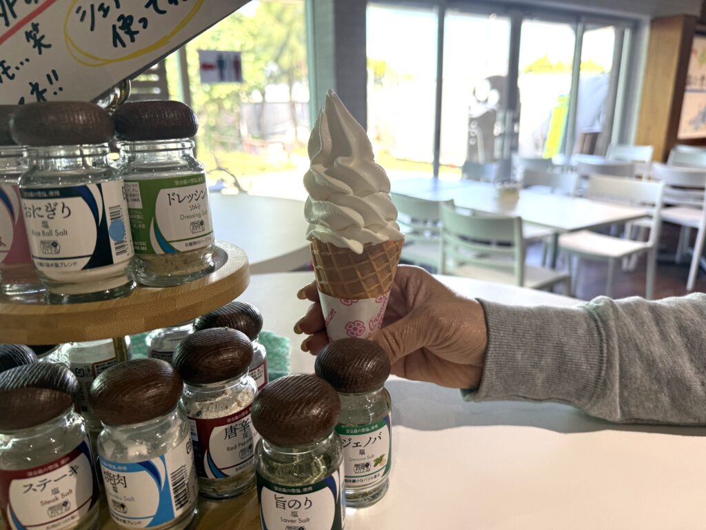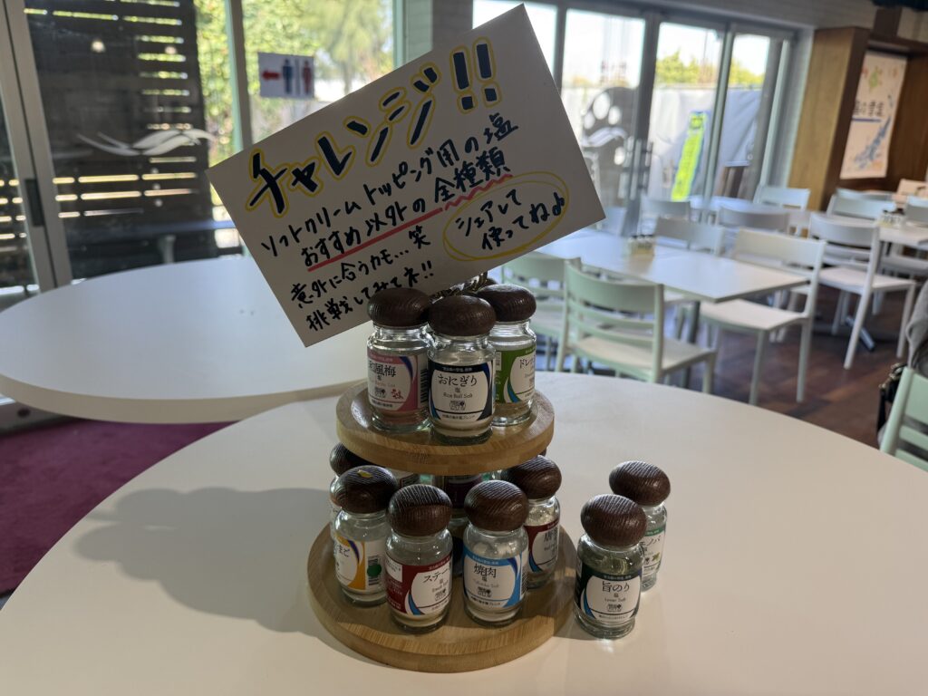 館内では画像のように、島素材を使った**「合わせ塩」**が用意されていて、ソフトにかけながら味変を楽しめます。