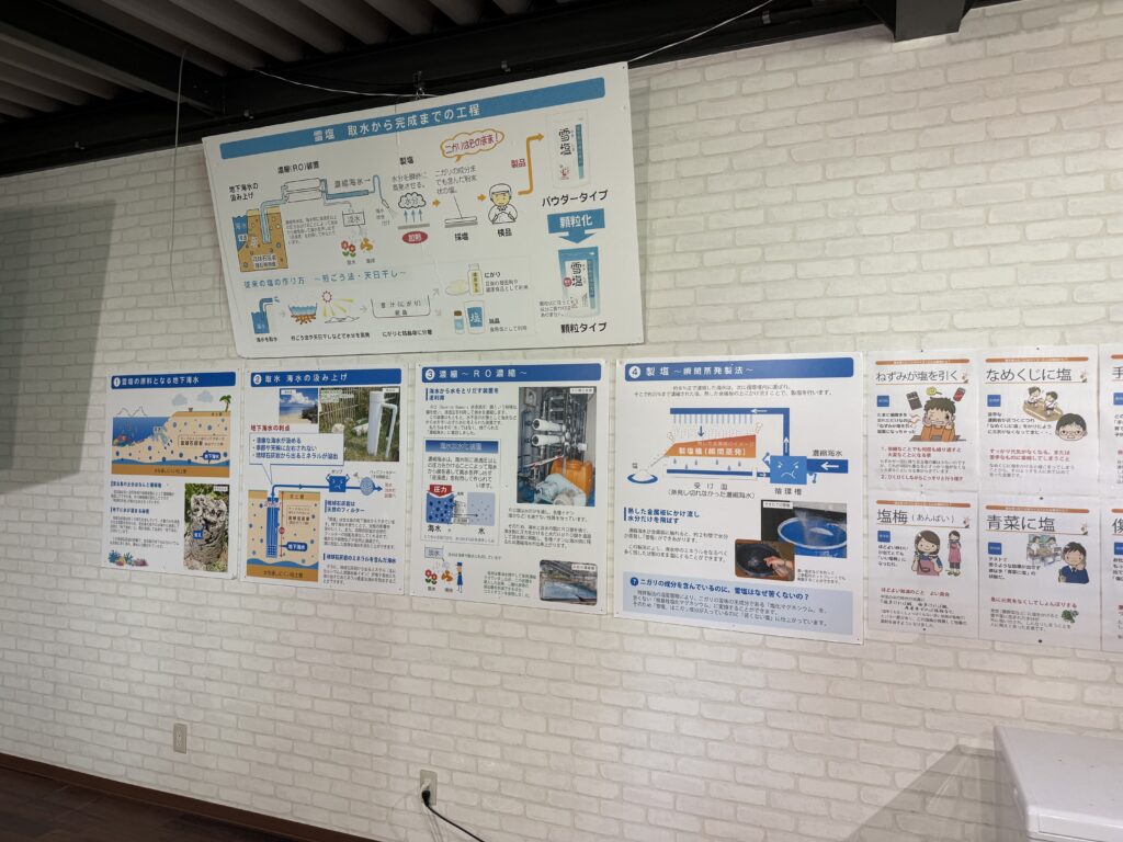 画像にもある通り、館内の壁面には**「取水→濃縮→製塩→製品」**までの流れが図解で紹介されており、製塩工程を初めて見る方でも楽しめます。
