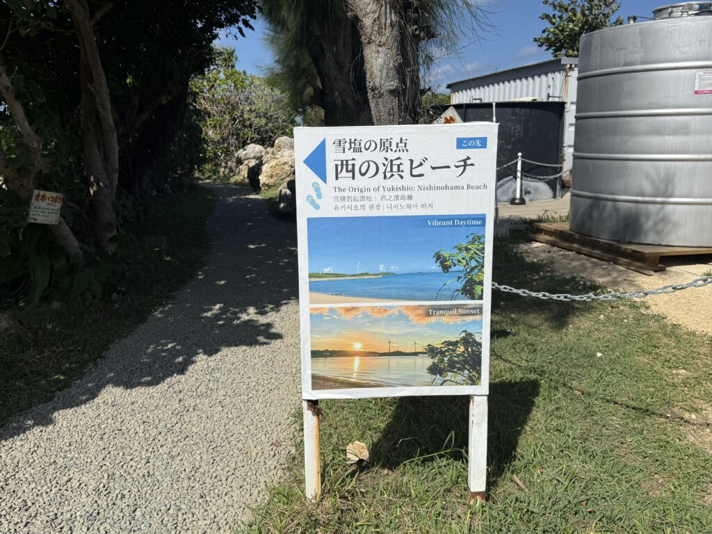 画像の看板にもしっかり写っている通り、雪塩ミュージアム周辺には**「雪塩の原点 西の浜ビーチ」**と案内されているルートがあります。