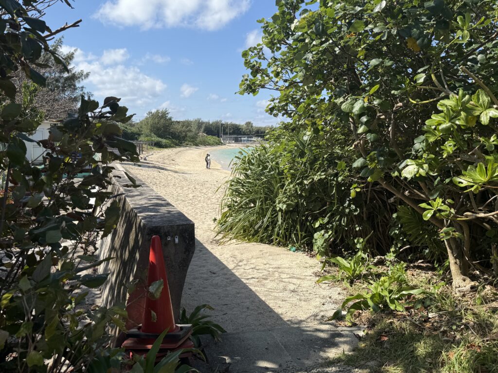 そして小道を抜けた先には、宮古ブルーの海と白い砂浜。人が少ない時間帯なら、波の音だけが聞こえるような静けさに包まれます。