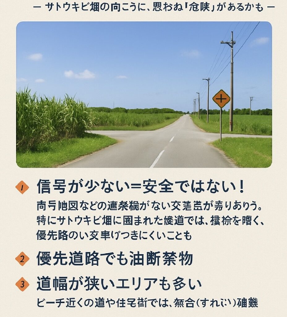 市街地を離れると、信号機のない交差点が多数あります。特にサトウキビ畑に囲まれた農道では、視界が悪く、優先道路の見分けがつきにくいことも。
