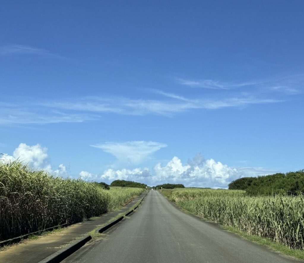 青い空と宮古ブルーの海、サトウキビ畑に囲まれたのどかな道。