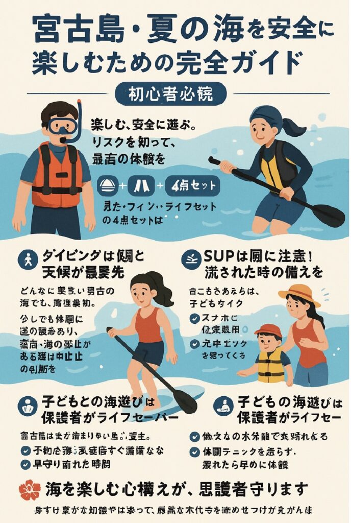 宮古島の海は美しい反面、離岸流や急な天候変化など自然特有のリスクもあります。安全に楽しむためには「事前確認・装備・無理をしない判断」が重要。本記事では初心者向けに、シュノーケリング・ダイビング・SUP・海水浴それぞれの注意点と安全対策を分かりやすく解説し、事故を防ぐための基本ルールをまとめています。